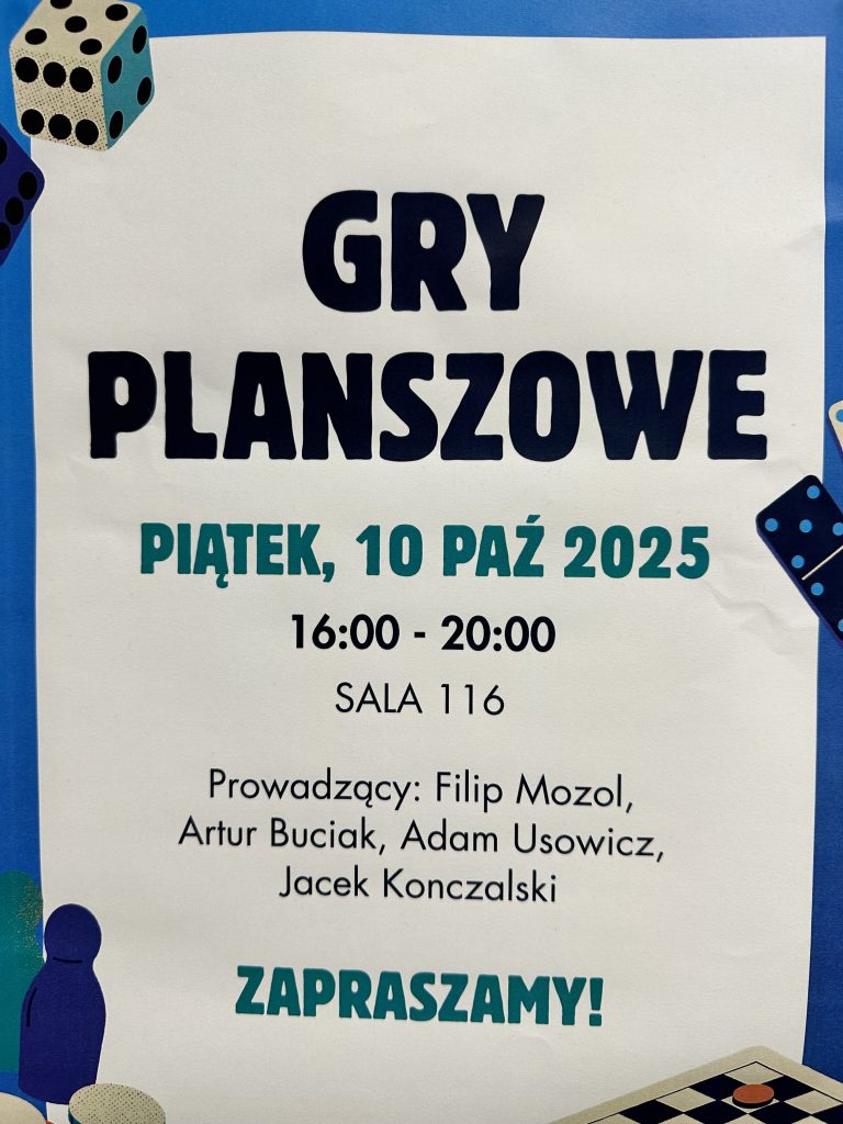 W najbliższy piątek, 10 października, odbędzie się w Naszej Szkole Dzień Gier Planszowych. W związku z tym zapraszamy wszystkich uczniów i nauczycieli do wspólnej celebracji w sali 116. Podczas spotkania będziemy grać w różne gry; będzie możliwość zarówno nauki gry w nowe tytuły, jak też przetestowania już sprawdzonych produkcji. Wydarzenie potrwa od 16:00 do 20:00. Do zobaczenia!